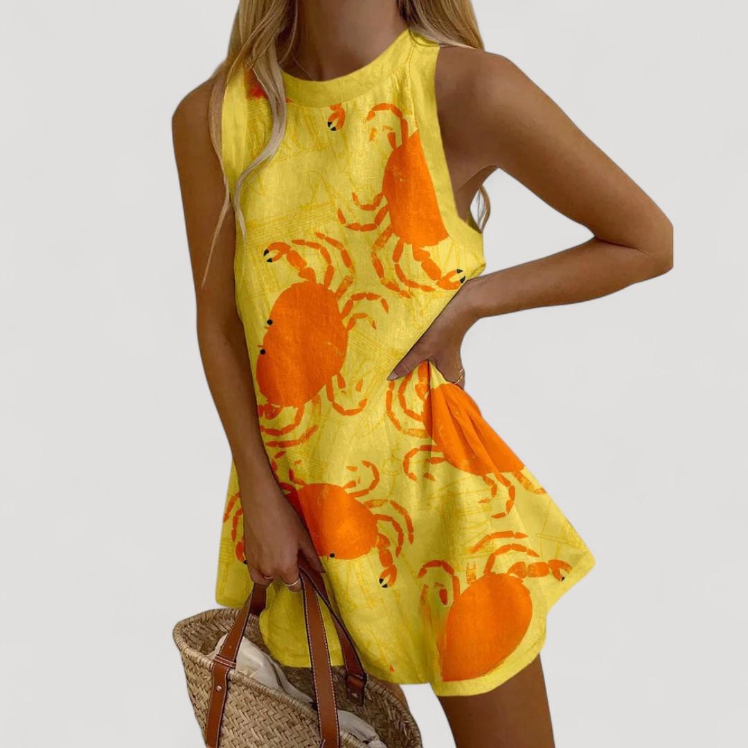 Beatrice™ juhlii kesää leikkisällä ja yllättävällä krabbi-kuvalla. Raikas, kevyt ja täynnä luonteenpiirteitä, se on täydellinen minimekko niille, jotka rakastavat erottua iloisesti ja tyylikkäästi, lomalla tai kaupungissa.