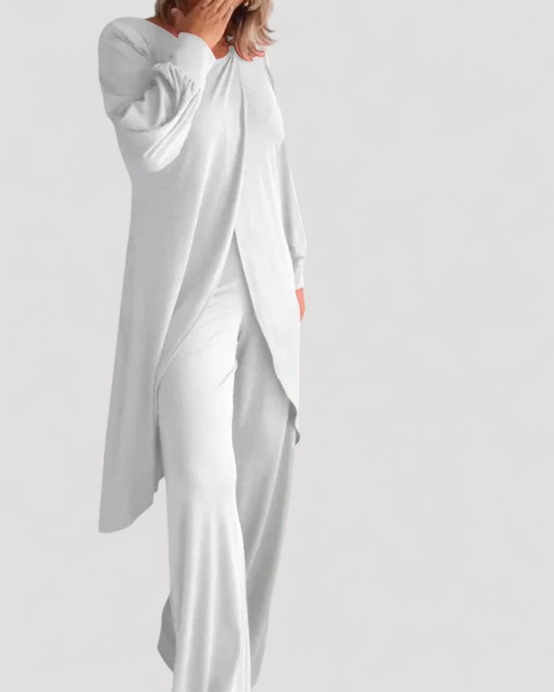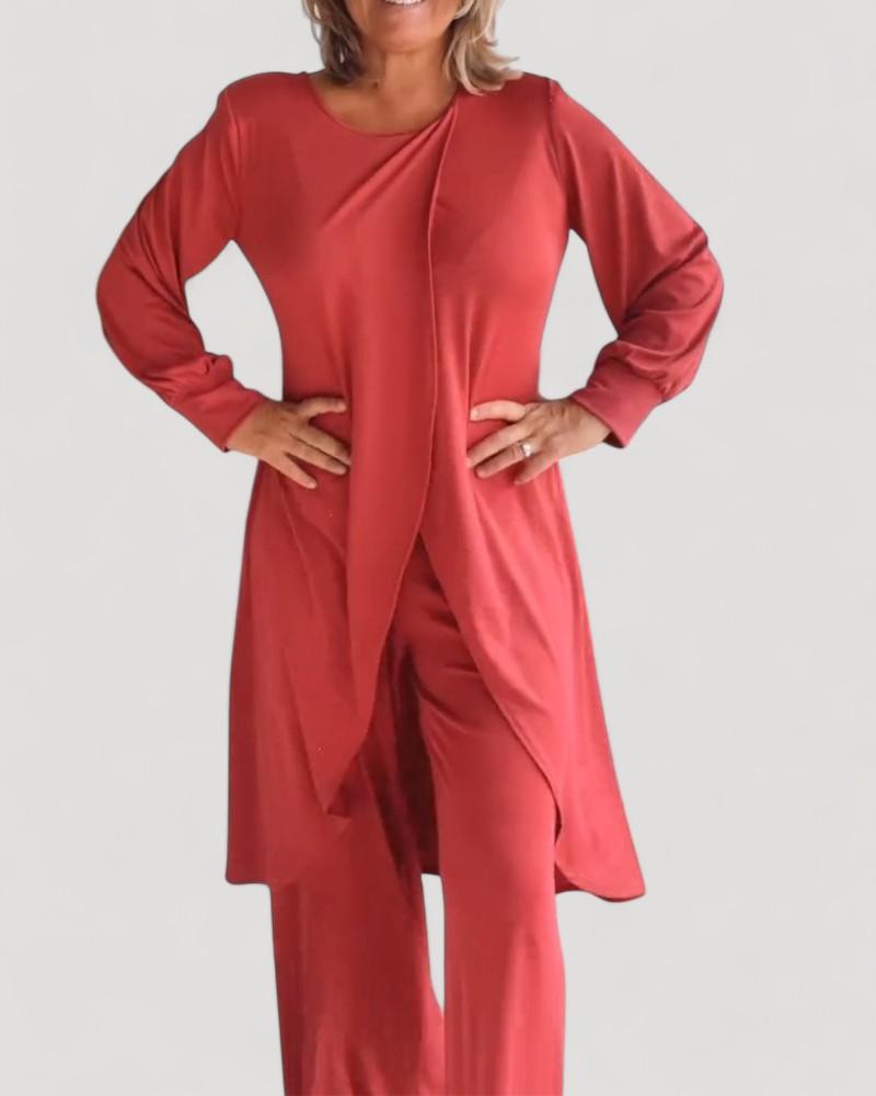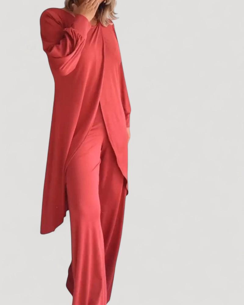 Budai™ – Elegantti ja Mukava 2 Kappaleen Setti on täydellinen valinta, jos haluat monikäyttöisen asun, joka sopii kaikkiin tilaisuuksiin. Setti koostuu pitkästä ja kietoutuvasta kardigaasta ja eleganteista housuista, ja se takaa hienostuneen ilmeen unohtamatta mukavuutta. Valmistettu pehmeistä ja samettisista kankaista, se tarjoaa rentoa istuvuutta, joka seuraa jokaista liikettäsi, tehden siitä täydellisen viileämpiin päiviin ja elegantteihin iltoihin.