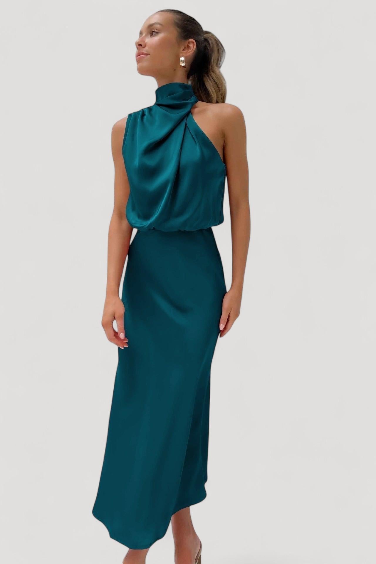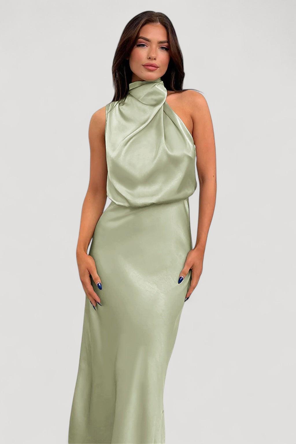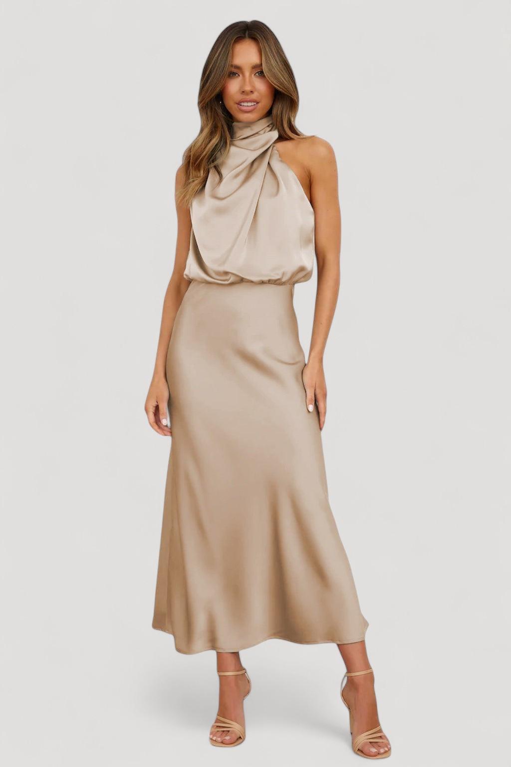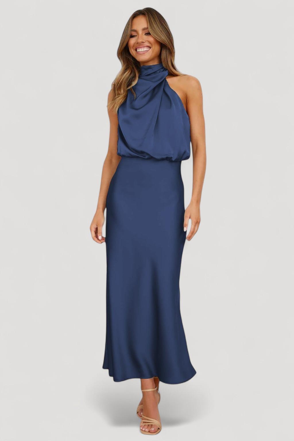 • Muotoilu: Pitkä satiinimekko halterneck-tyylillä