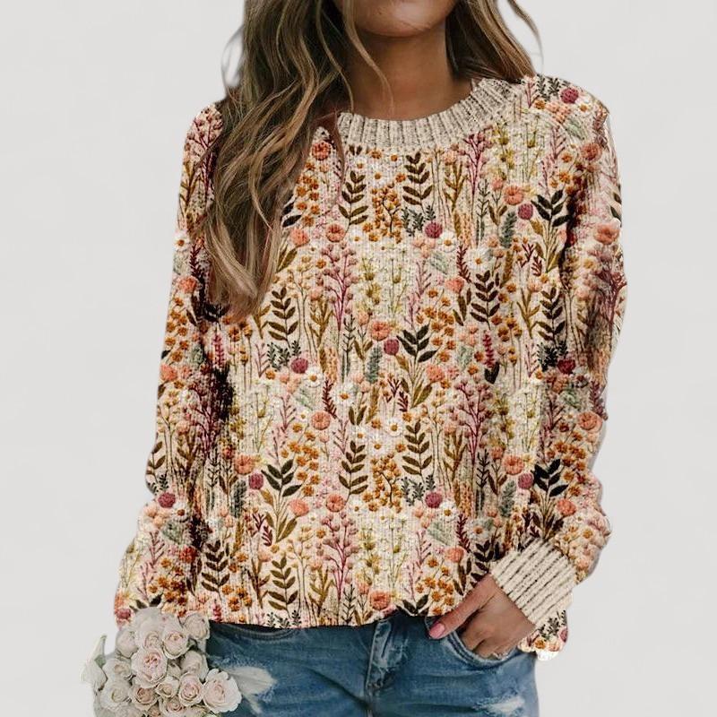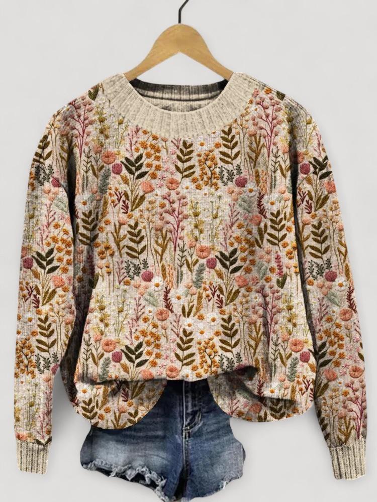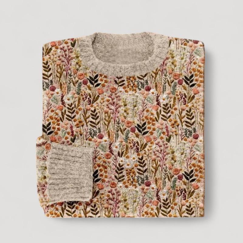 Koe pehmeä mukavuus huolellisesti valmistetusta neuleesta, jossa on hienovaraisia kukkakirjontoja — tarpeeksi lämmin viileille päiville ja tarpeeksi tyylikäs juhlallisiin tilaisuuksiin.