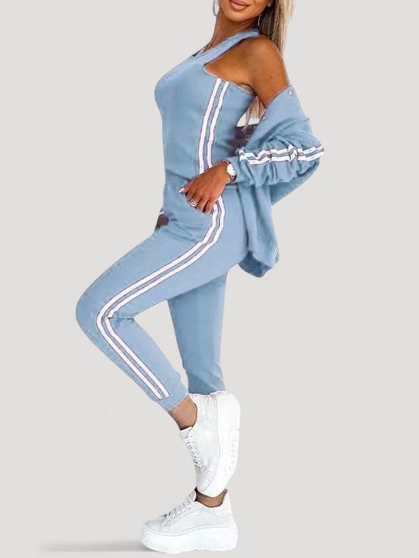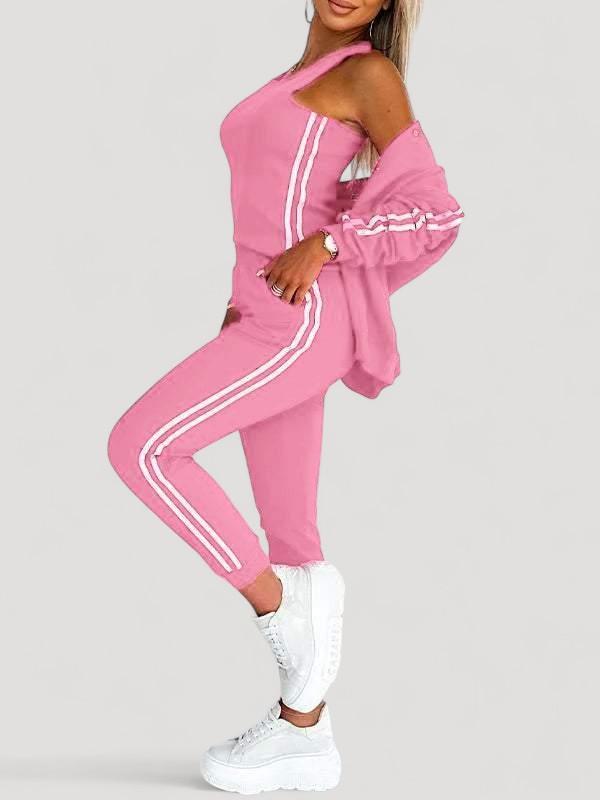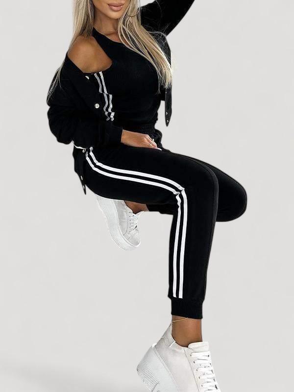 Koordinoitu ja Monikäyttöinen Suunnittelu – Sisältää retrotyylisen baseballtakki sivu- ja yläviivoilla, corsettiselkäisen topin ja kapeat urheiluhousut, täydellisesti koordinoidun ja tyylikkään ilmeen saavuttamiseksi.