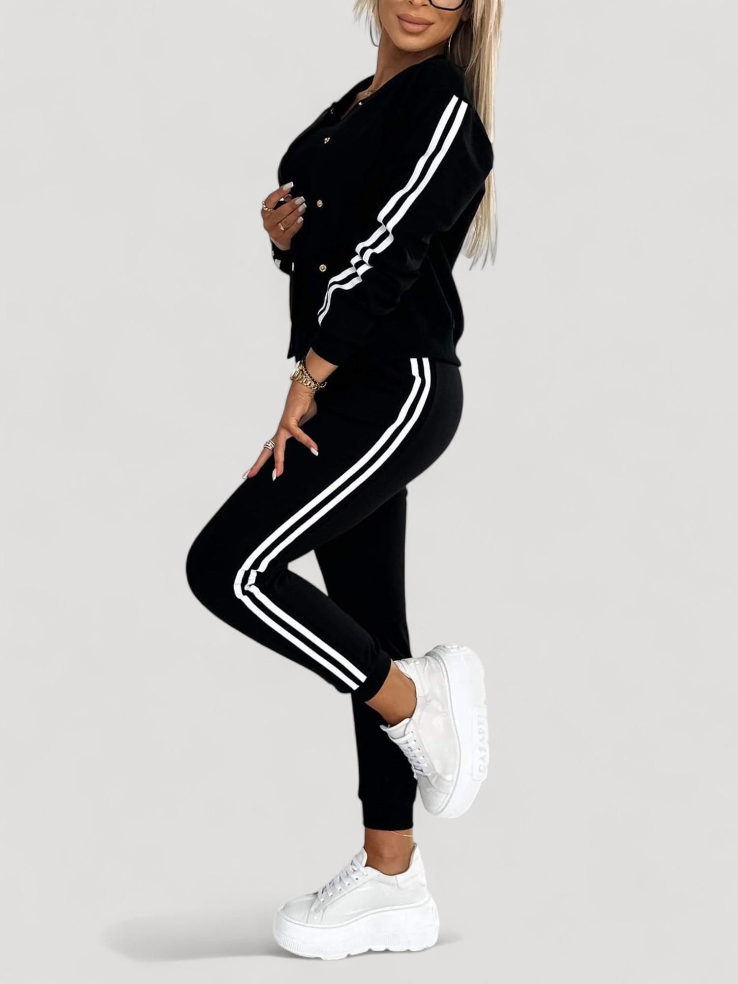Tyylikkäät Sivuviivat – Sivupalkit takissa ja housuissa yhdistävät urheilullisia ja muotielementtejä hienostuneessa ja dynaamisessa ilmeessä.